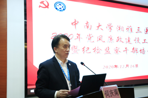 何庆南作题为“以优良的党风促政风带行风,为医院‘十四五’跨越发展提供坚实保障”的工作报告。他认为,医院过去一年来,政治引领作用更突出,党建业务融合更紧密,惩治预防体系更完善,医院正风肃纪全面提速、持续发力,特别是在抗击新冠肺炎疫情战斗中的新湘雅抗疫精神,引领医院党风政风总体向好向善、风清正气。他对加强新时代党风廉政建设主要任务进行部署:一是旗帜鲜明讲政治,把党的政治建设摆在首位;二是锲而不舍补足钙,持续深化思想政治教育;三是持之以恒转作风,严查各类顶风违纪行为;四是勠力同心强高压,压实压紧主体责任和岗位职责;五是笃定前行严要求,时刻注意检点自己,时刻严格要求自己,以全面从严治党永远在路上的坚韧和执着,为全面推进医院改革发展和“十四五”规划新篇章同心协力、励精图治,开拓创新、努力奋斗。
