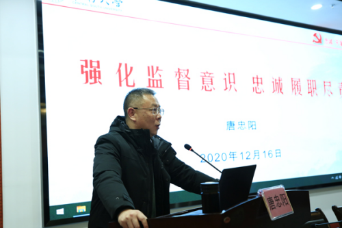 唐忠阳以“强化监督意识,忠诚履职尽责”为题进行授课。他认为,监督是纪检监察干部履职尽责的重要抓手,是防范风险的重要方式,是治病救人的有效手段,是纪检监察机关的首要职责。他结合近期部分高校、医院发生的违纪违法典型案例,要求纪检监察干部做到“三个要”:一是思想认识要到位,监督治病救人,而不是整人害人,“红脸出汗”有助于发现干部工作中的问题,对排除干部的“体内瘀毒”有促进作用;二是“两个责任”要落实,纪检监察干部要当好党内政治生态的“护林员”,既要盯住政治、经济方面的“硬腐败”,也要盯住不担当、不负责、不作为的“软腐败”和损害群众利益、损害公平的“微腐败”;三是敢于监督善作为,纪检监察干部要敢于“亮剑”,坚决遏制特权思想和特权现象滋长蔓延,牢牢抓住保持党同人民群众的血肉联系这个根本。